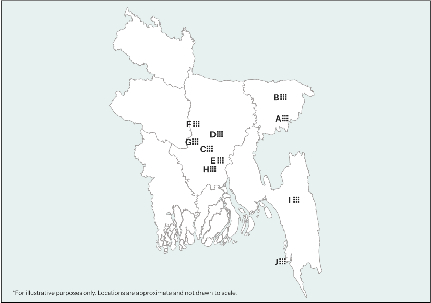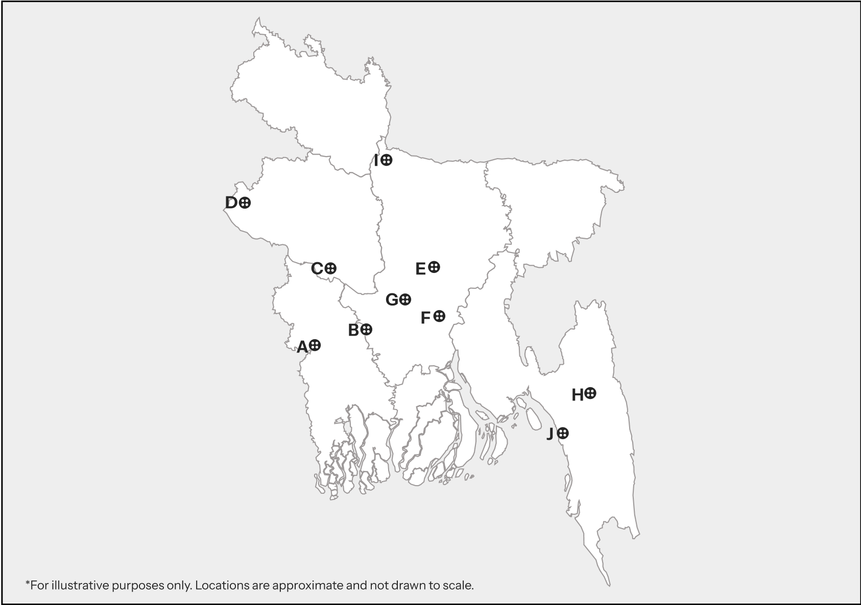 Moulvibazar(A), Sylhet City(B), Bhaluka Dhaka city(C), Gazipur(D), Narayanganj(E), Tangail(F), Manikganj(G), Munshi Ganj(G), Chattogram city(H), Cox’s Bazar(I)