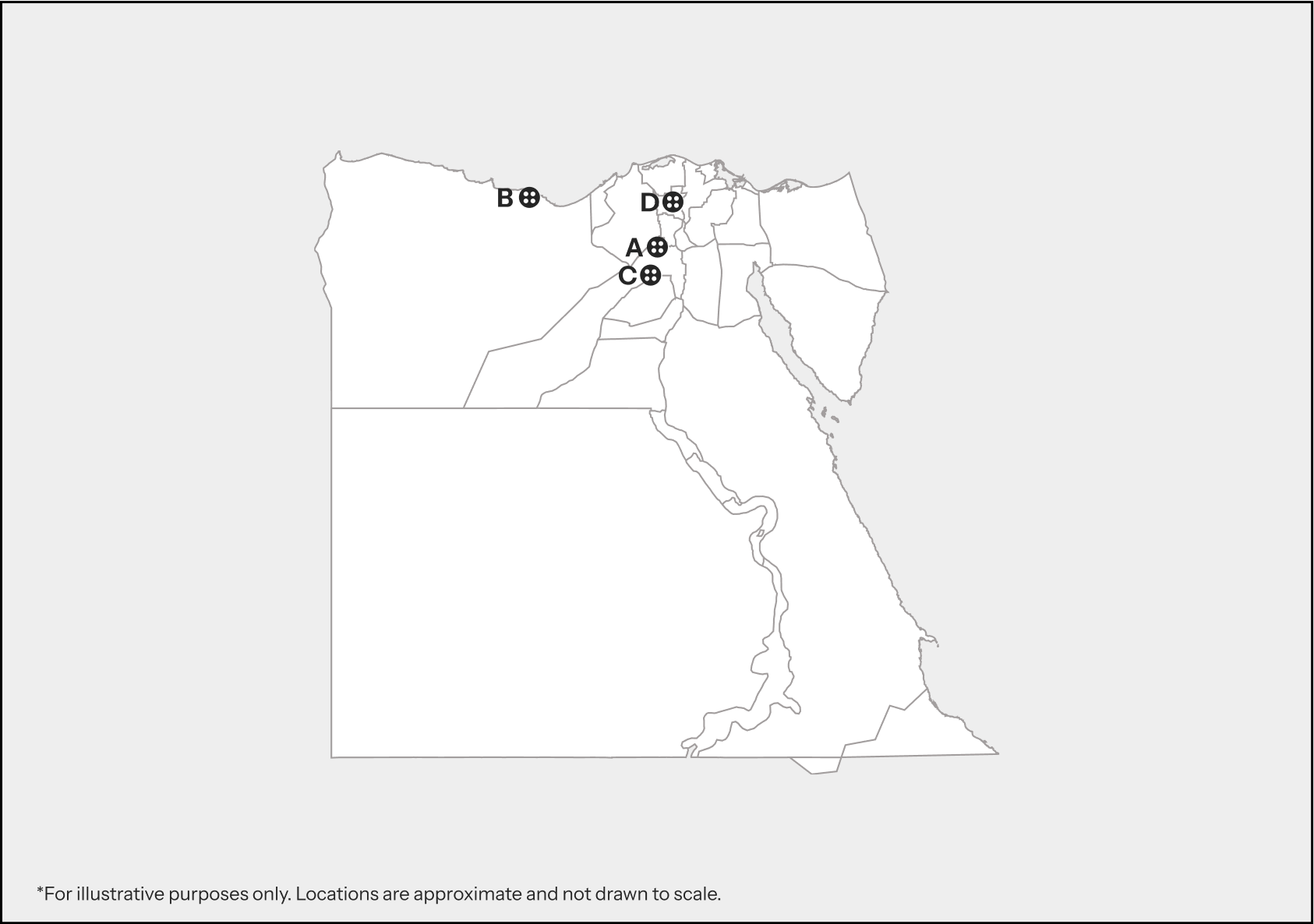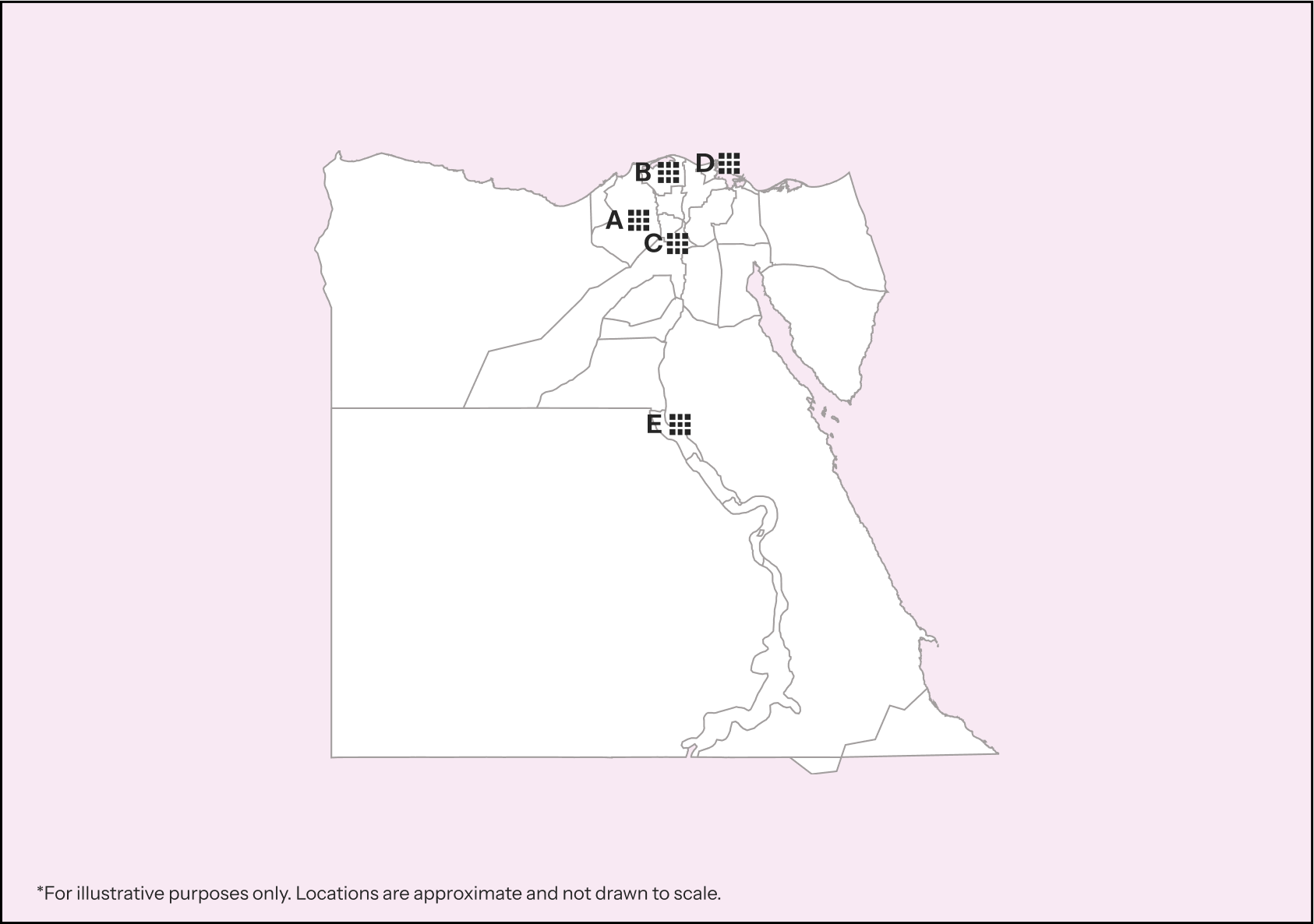 Beheira(A), Kafr El-Sheikh(B), Monufia(C), Damietta (all Lower Egypt)(E), Upper Egypt (includes Beni Suef, Sohag)(F)