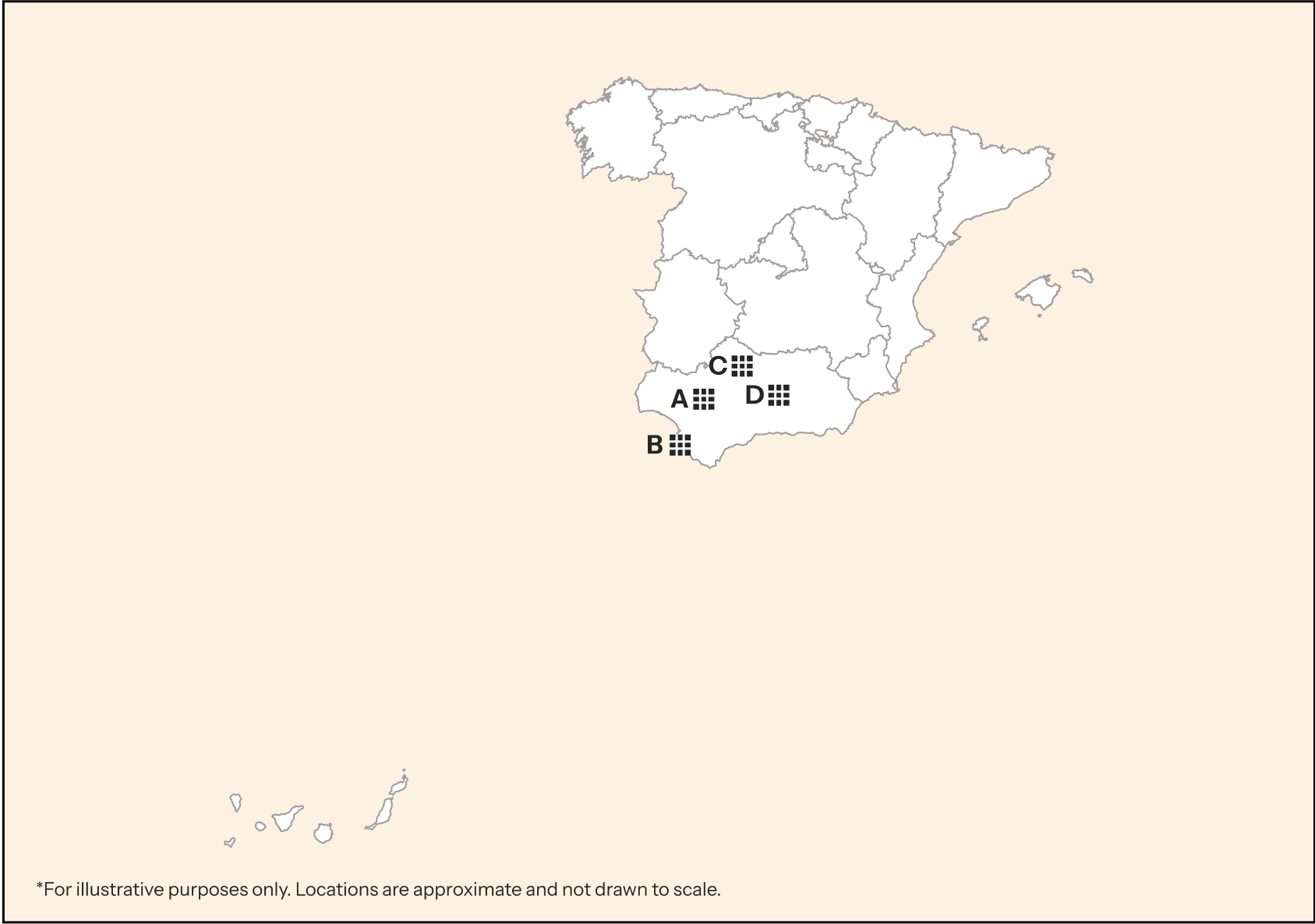 Seville(A), Cadiz(B), Cordoba(C), and Jaen(D)