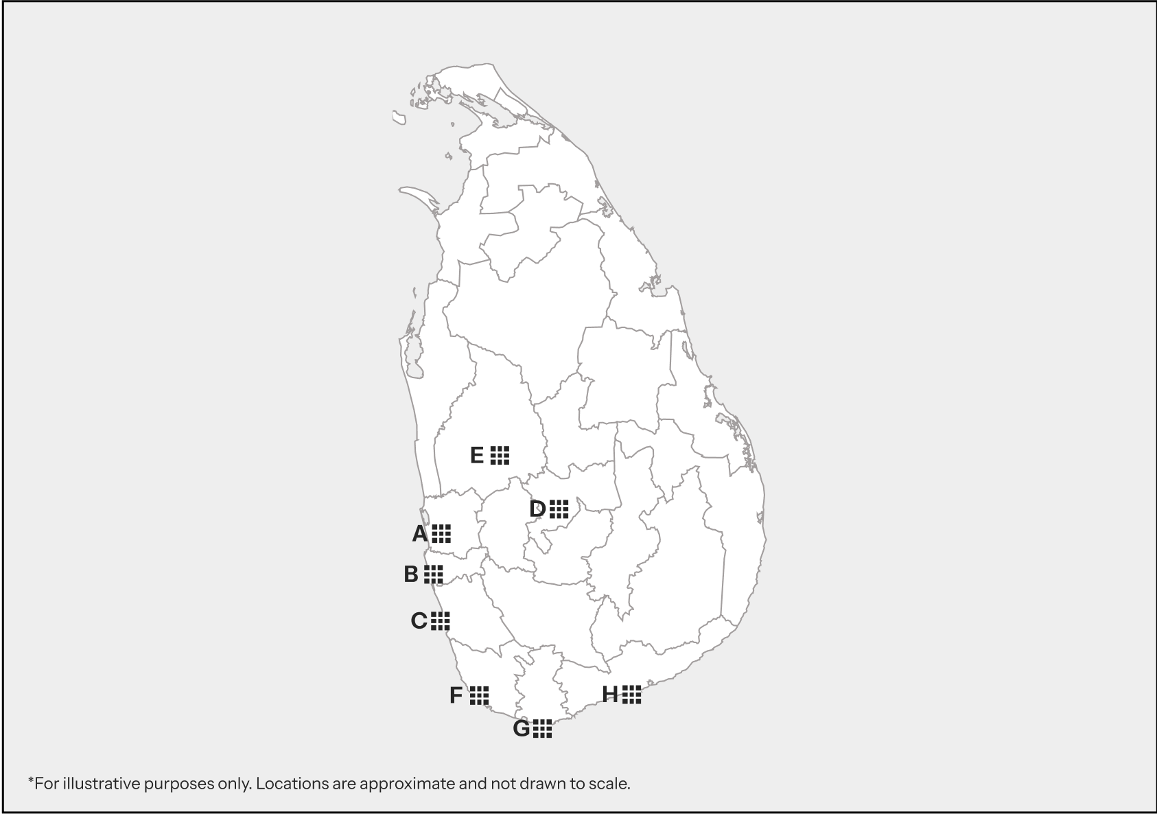 Textile Clusters- Gampaha(A), Colombo(B), Kalutara(C), Kandy(D), Kurunegala(E), Galle(F), Matara(G), Hambantota(H)