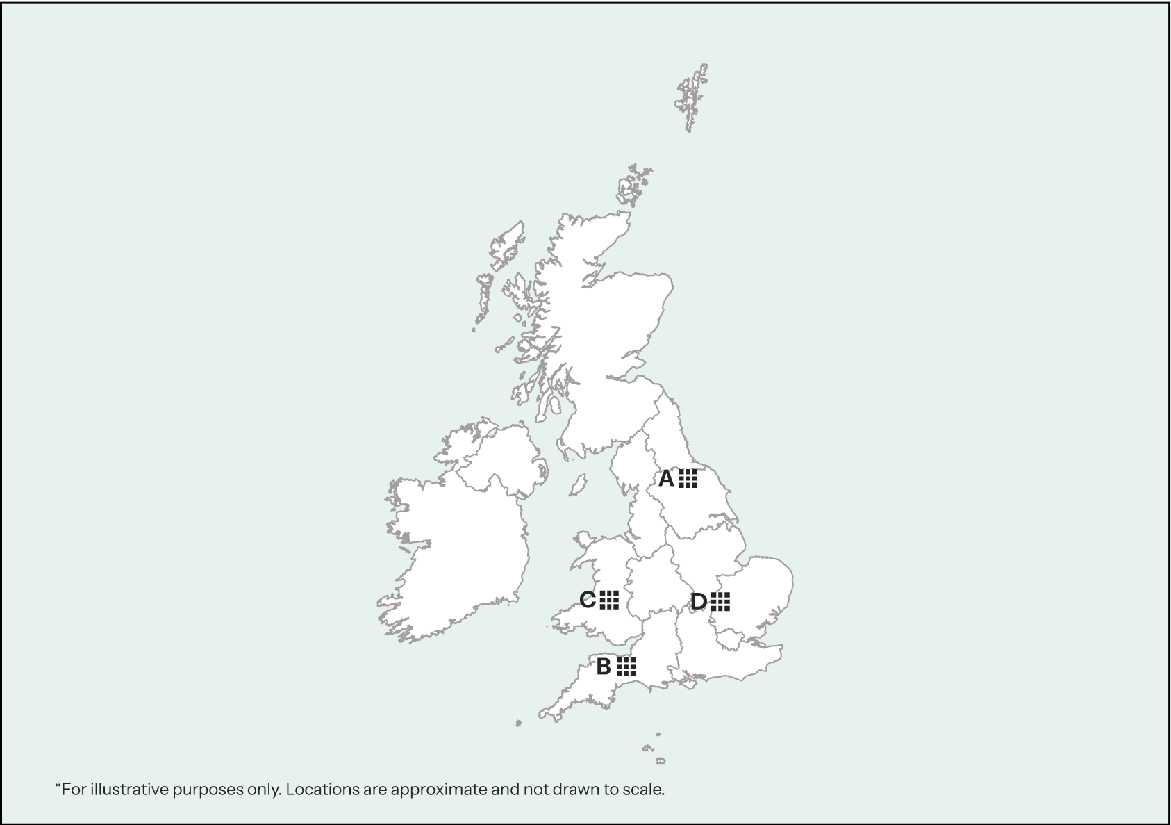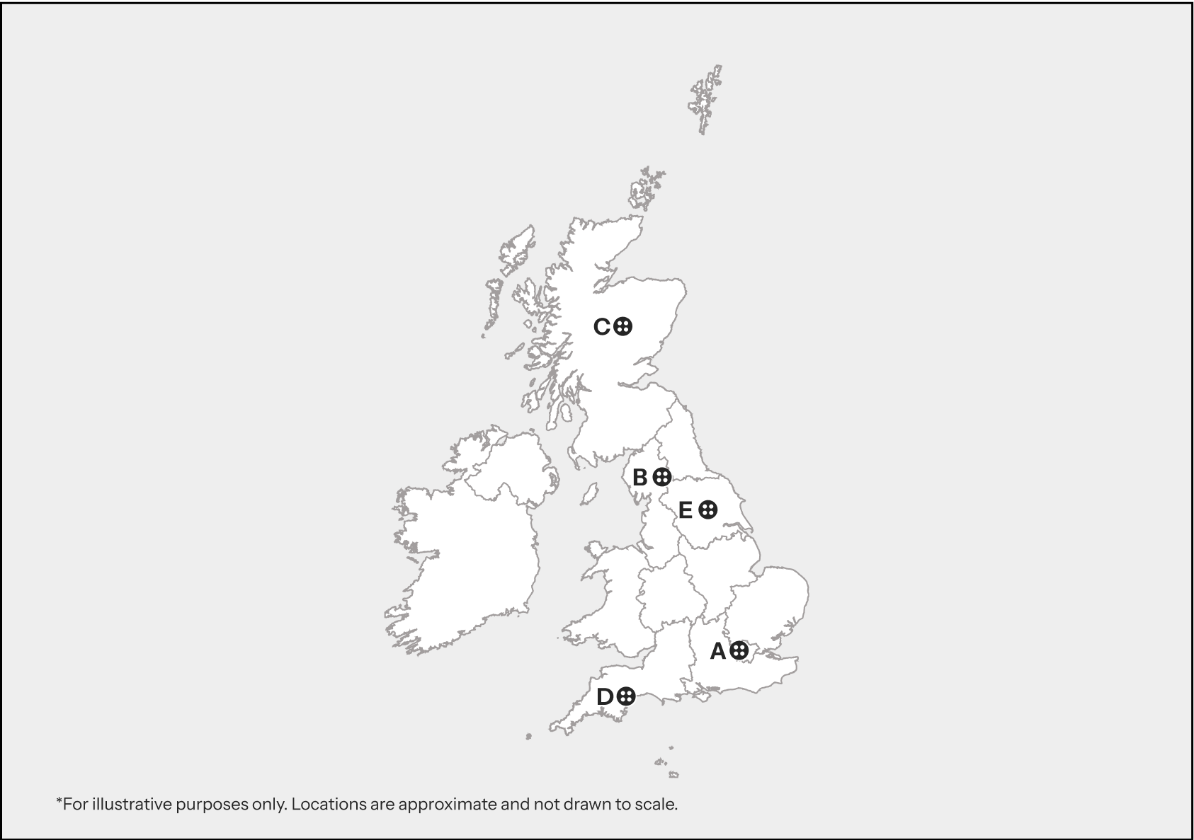 London(A), North West (England)(B), Scotland(C), South West (England)(D), Yorkshire(E) & the Humber(F)